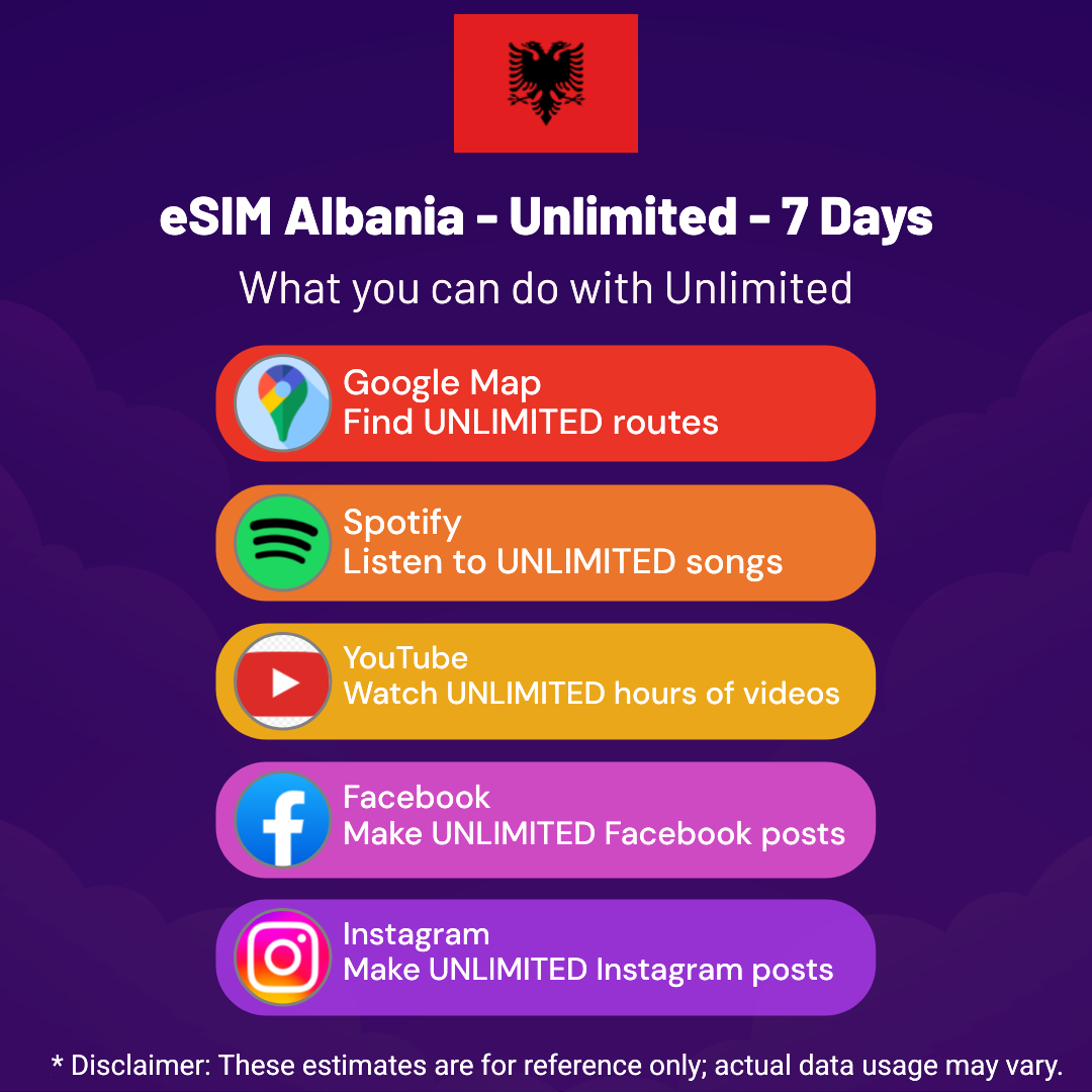 Hello, Globetrotter! 🚀 Gearing up for a journey to the world’s hidden gem, Albania? Let our Unlimited – 7 Days eSIM be your reliable digital ally, ensuring you remain connected at every step!