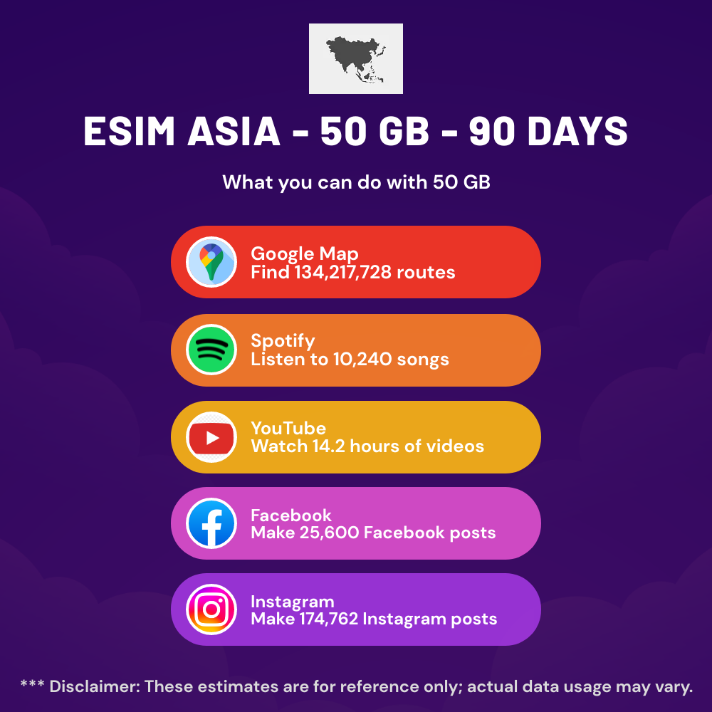 Hello, Globetrotter! 🚀 Gearing up for a journey to the world’s hidden gem, Asia? Let our 50 GB – 90 Days eSIM be your reliable digital ally, ensuring you remain connected at every step!