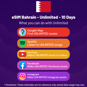 Hello, Globetrotter! 🚀 Gearing up for a journey to the world’s hidden gem, Bahrain? Let our Unlimited – 10 Days eSIM be your reliable digital ally, ensuring you remain connected at every step!
