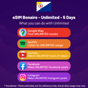 Hello, Globetrotter! 🚀 Gearing up for a journey to the world’s hidden gem, Bonaire? Let our Unlimited – 5 Days eSIM be your reliable digital ally, ensuring you remain connected at every step!