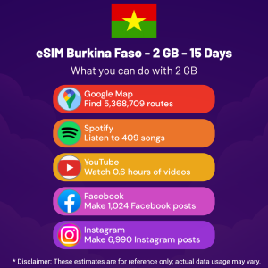 Hello, Globetrotter! 🚀 Gearing up for a journey to the world’s hidden gem, Burkina Faso? Let our 2 GB – 15 Days eSIM be your reliable digital ally, ensuring you remain connected at every step!