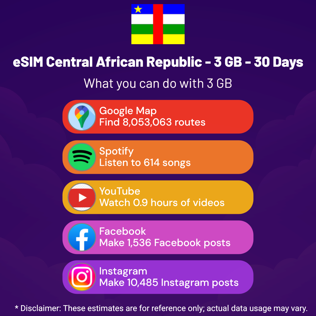 Hello, Globetrotter! 🚀 Gearing up for a journey to the world’s hidden gem, Central African Republic? Let our 3 GB – 30 Days eSIM be your reliable digital ally, ensuring you remain connected at every step!
