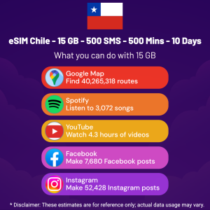 Hello, Globetrotter! 🚀 Gearing up for a journey to the world’s hidden gem, Chile? Let our 15 GB – 500 SMS – 500 Mins – 10 Days eSIM be your reliable digital ally, ensuring you remain connected at every step!