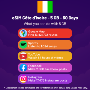 Hello, Globetrotter! 🚀 Gearing up for a journey to the world’s hidden gem, Côte d’Ivoire? Let our 5 GB – 30 Days eSIM be your reliable digital ally, ensuring you remain connected at every step!