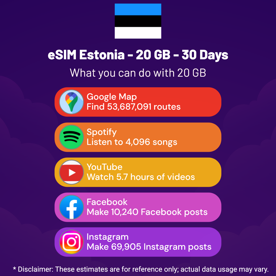 Hello, Globetrotter! 🚀 Gearing up for a journey to the world’s hidden gem, Estonia? Let our 20 GB – 30 Days eSIM be your reliable digital ally, ensuring you remain connected at every step!