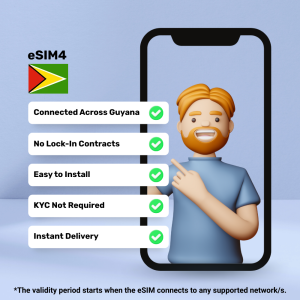 Operates on Guyana Telephone & Telegraph network in Guyana. This eSIM doesn’t come with a phone number.