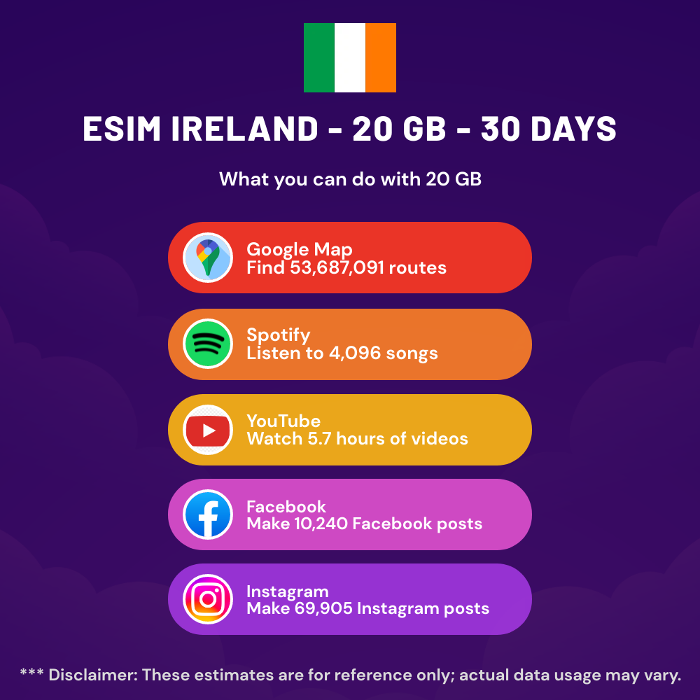 Hello, Globetrotter! 🚀 Gearing up for a journey to the world’s hidden gem, Ireland? Let our 20 GB – 30 Days eSIM be your reliable digital ally, ensuring you remain connected at every step!