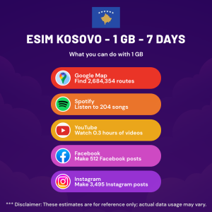 Hello, Globetrotter! 🚀 Gearing up for a journey to the world’s hidden gem, Kosovo? Let our 1 GB – 7 days eSIM be your reliable digital ally, ensuring you remain connected at every step!