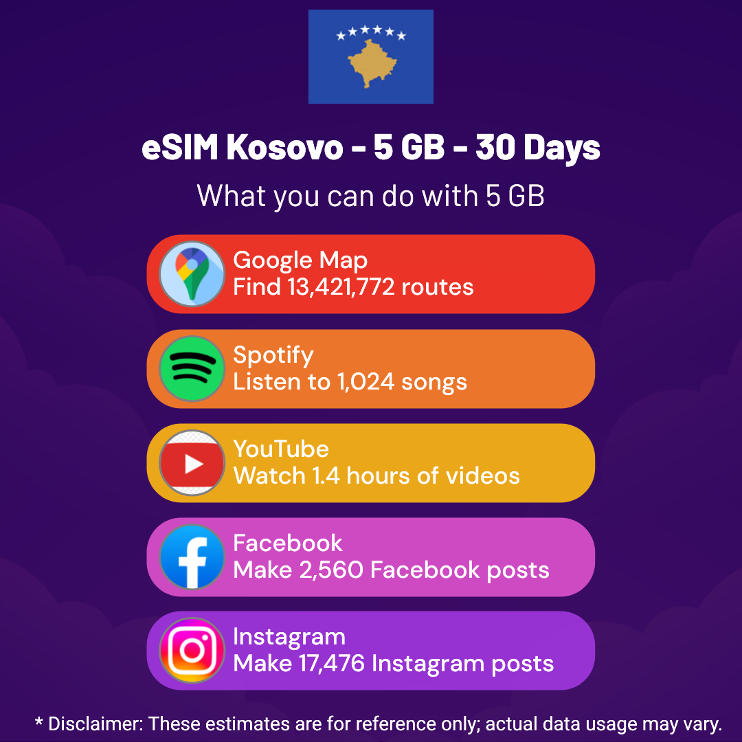 Hello, Globetrotter! 🚀 Gearing up for a journey to the world’s hidden gem, Kosovo? Let our 5 GB – 30 Days eSIM be your reliable digital ally, ensuring you remain connected at every step!