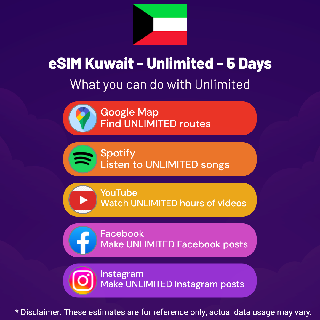 Hello, Globetrotter! 🚀 Gearing up for a journey to the world’s hidden gem, Kuwait? Let our Unlimited – 5 Days eSIM be your reliable digital ally, ensuring you remain connected at every step!