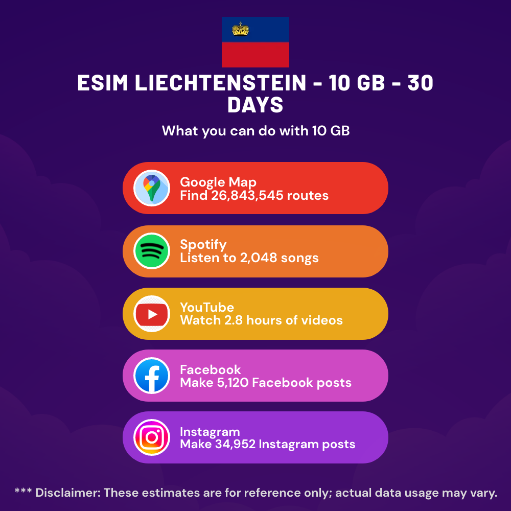Hello, Globetrotter! 🚀 Gearing up for a journey to the world’s hidden gem, Liechtenstein? Let our 10 GB – 30 Days eSIM be your reliable digital ally, ensuring you remain connected at every step!