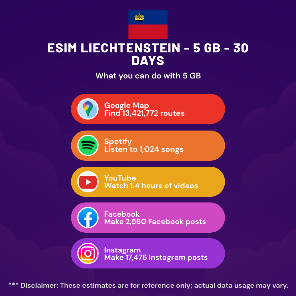Hello, Globetrotter! 🚀 Gearing up for a journey to the world’s hidden gem, Liechtenstein? Let our 5 GB – 30 Days eSIM be your reliable digital ally, ensuring you remain connected at every step!