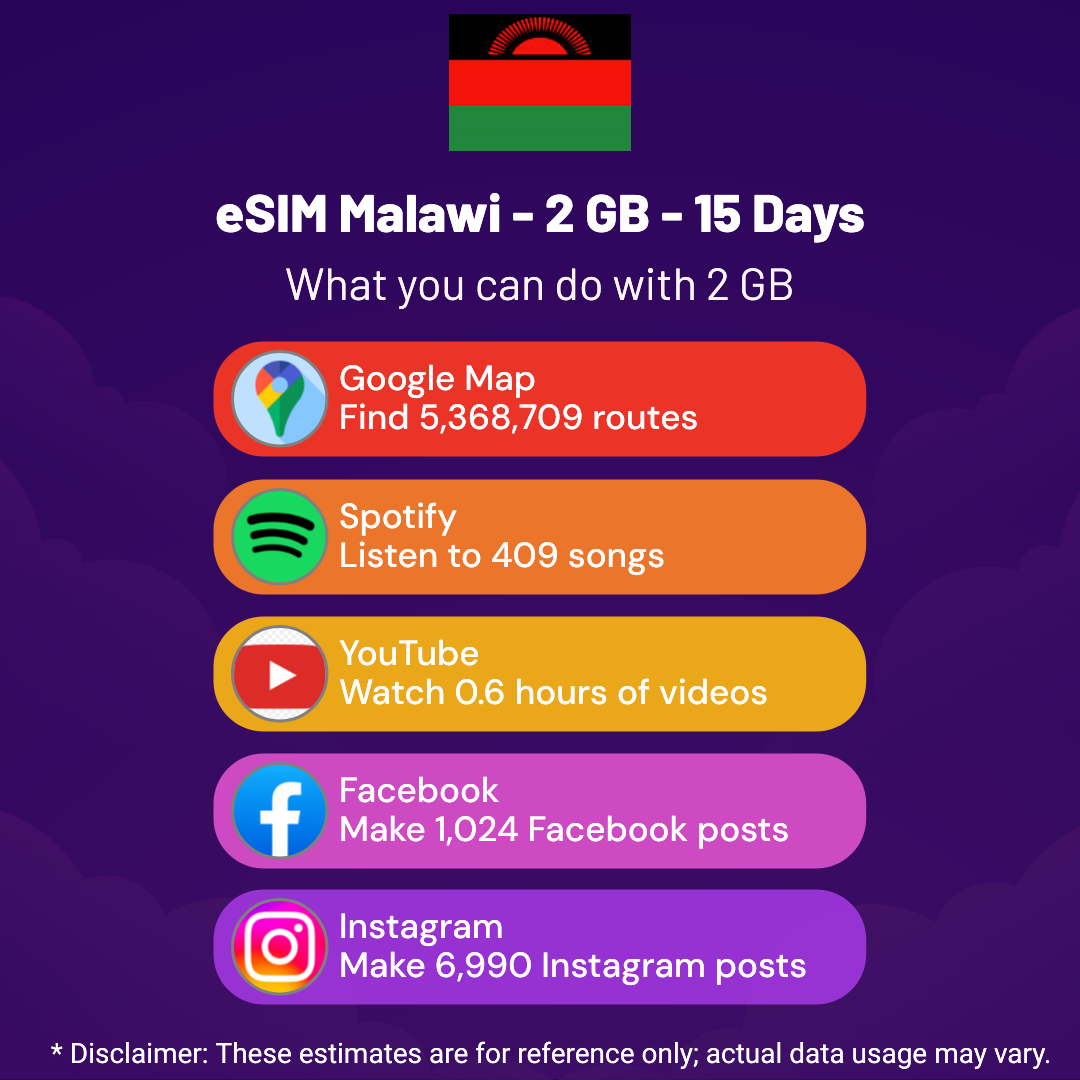 Hello, Globetrotter! 🚀 Gearing up for a journey to the world’s hidden gem, Malawi? Let our 2 GB – 15 Days eSIM be your reliable digital ally, ensuring you remain connected at every step!