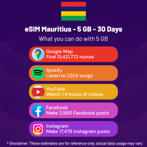 Hello, Globetrotter! 🚀 Gearing up for a journey to the world’s hidden gem, Mauritius? Let our 5 GB – 30 Days eSIM be your reliable digital ally, ensuring you remain connected at every step!