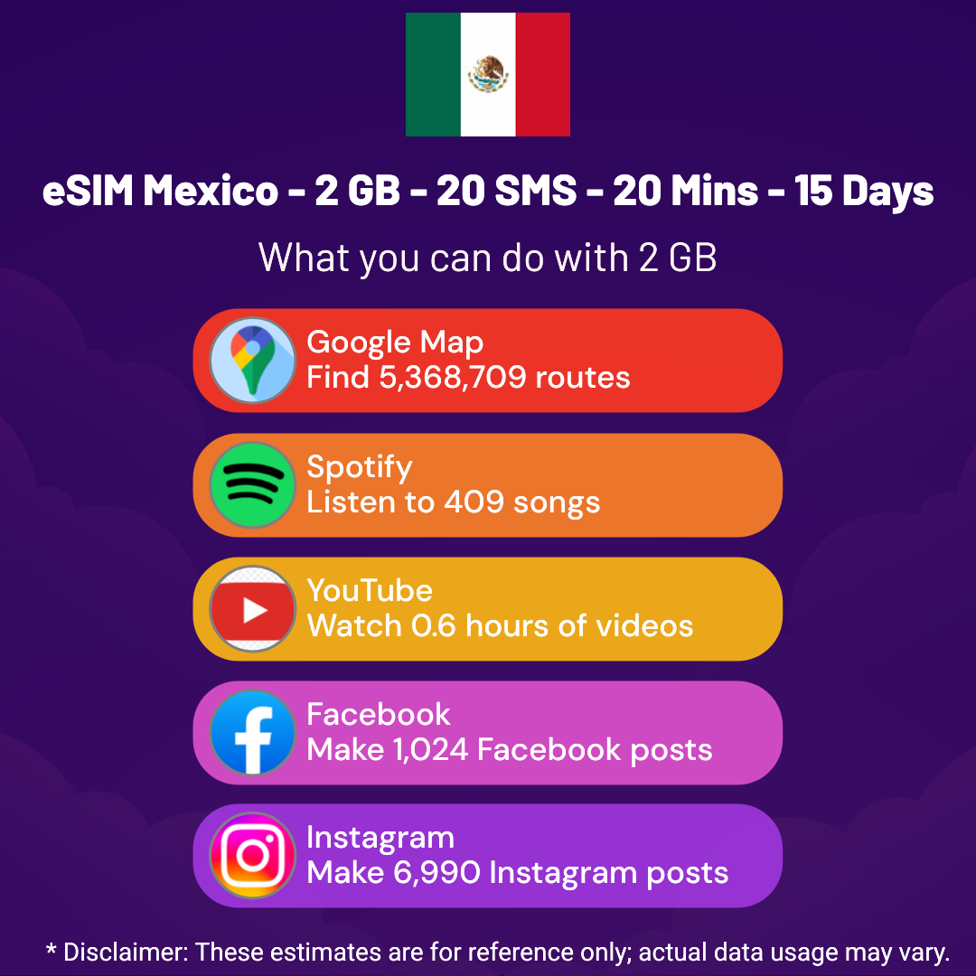 eSIM Mexico – 2 GB – 20 SMS – 20 Mins – 15 Days