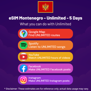 Hello, Globetrotter! 🚀 Gearing up for a journey to the world’s hidden gem, Montenegro? Let our Unlimited – 5 Days eSIM be your reliable digital ally, ensuring you remain connected at every step!