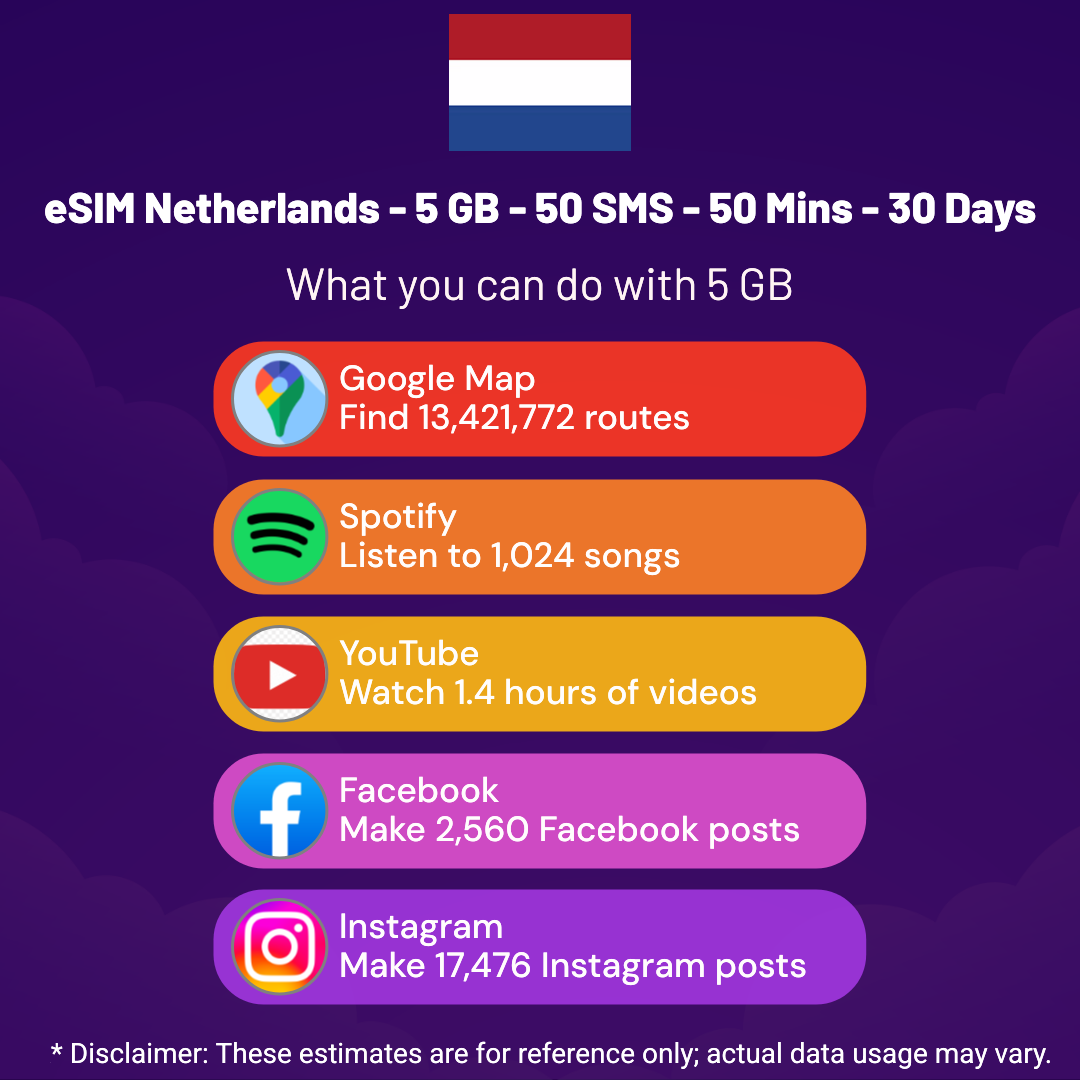 Hello, Globetrotter! 🚀 Gearing up for a journey to the world’s hidden gem, Netherlands? Let our 5 GB – 50 SMS – 50 Mins – 30 Days eSIM be your reliable digital ally, ensuring you remain connected at every step!