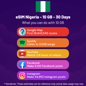 Hello, Globetrotter! 🚀 Gearing up for a journey to the world’s hidden gem, Nigeria? Let our 10 GB – 30 Days eSIM be your reliable digital ally, ensuring you remain connected at every step!