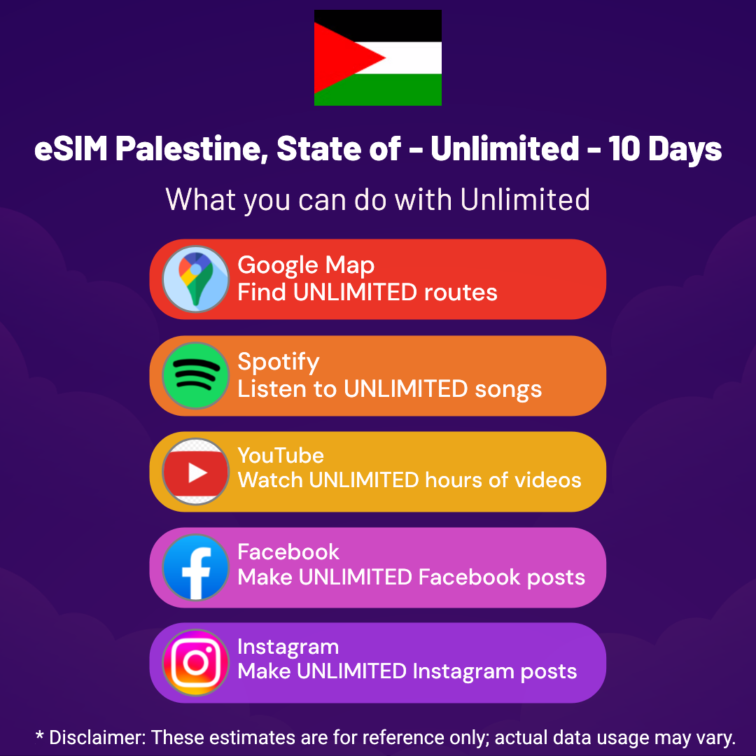 Hello, Globetrotter! 🚀 Gearing up for a journey to the world’s hidden gem, Palestine, State of? Let our Unlimited – 10 Days eSIM be your reliable digital ally, ensuring you remain connected at every step!