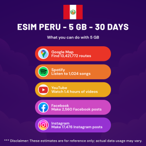 Hello, Globetrotter! 🚀 Gearing up for a journey to the world’s hidden gem, Peru? Let our 5 GB – 30 days eSIM be your reliable digital ally, ensuring you remain connected at every step!