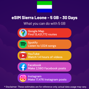 Hello, Globetrotter! 🚀 Gearing up for a journey to the world’s hidden gem, Sierra Leone? Let our 5 GB – 30 Days eSIM be your reliable digital ally, ensuring you remain connected at every step!