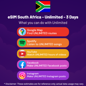 Hello, Globetrotter! 🚀 Gearing up for a journey to the world’s hidden gem, South Africa? Let our Unlimited – 3 Days eSIM be your reliable digital ally, ensuring you remain connected at every step!