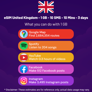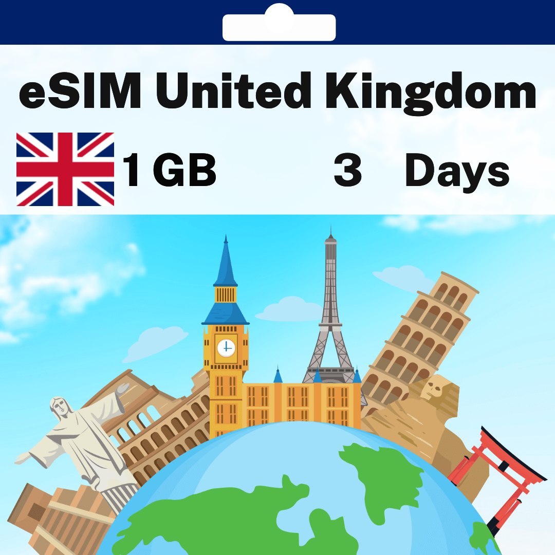 eSIM United Kingdom – 1 GB – 10 SMS – 10 Mins – 3 days